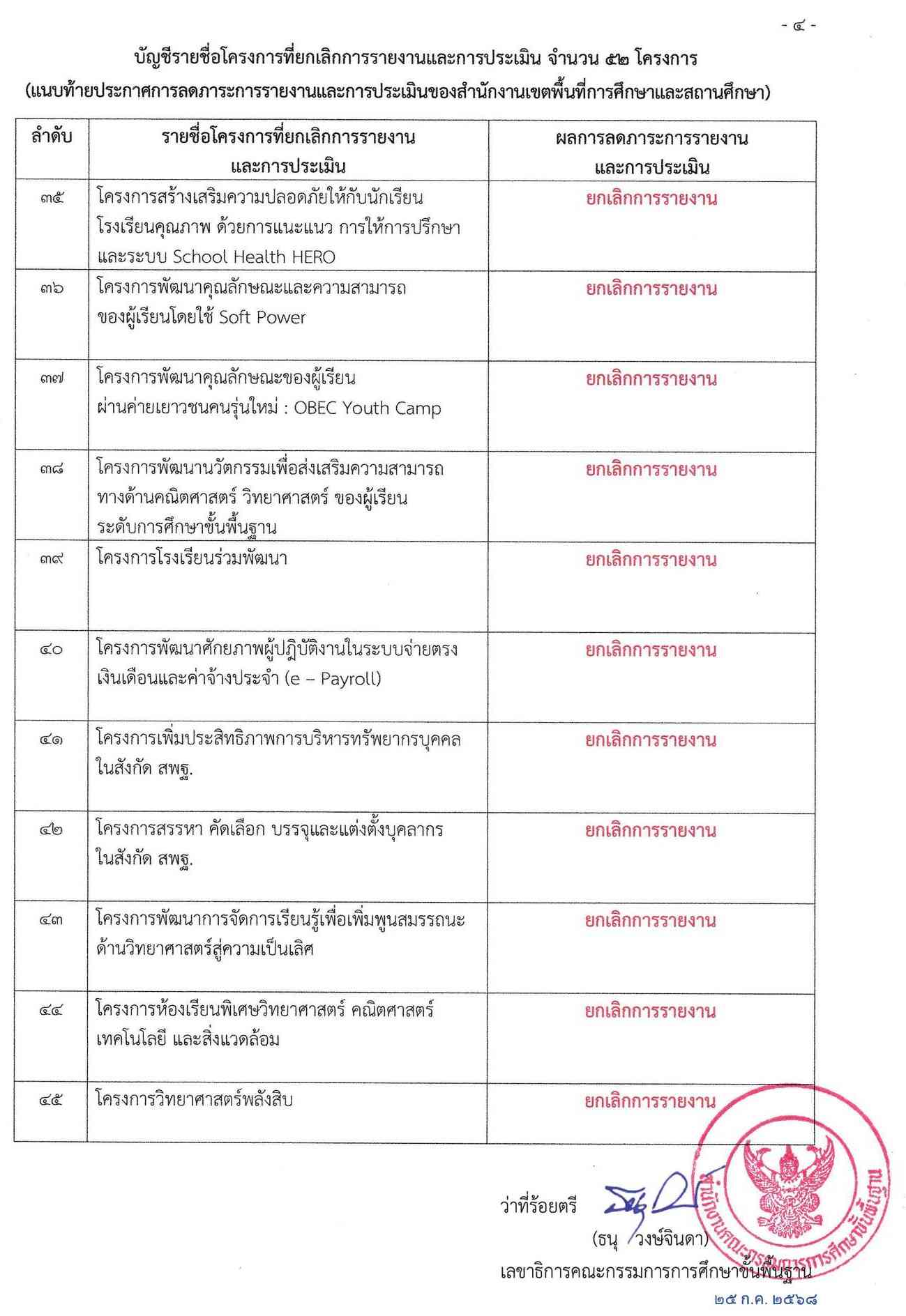 ยกเลิกการรายงาน ยกเลิกการรายงาน กเลิกการรายงาน ส่งผลให้ลดภาระที่ไม่จำเป็นและซ้ำซ้อน เรียนดี มีความสุข เพิ่มประสิทธิภาพ โดยมุ่งเน้นการจัดการเรียนการสอนและพัฒนาผู้เรียนได้เต็มศักยภาพ และมีประสิทธิภาพ มีทั้งหมด 52 โครงการ ตามรายชื่อโครงการที่ยกเลิกการรายงาน และการประเมิน ประกาศเมื่อ 25 กรกฎาคม 2568 มีดังนี้